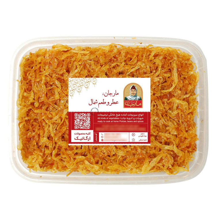 پیاز سرخ شده خلال مارجان سایز خلال شده پیازها یکدست میباشد. سرخ شده در یکبار روغن اّب پیاز گرفته نشده تهیه شده به روش کاملا سنتی بسته بندی در ظروف طب دارای استاندارد نگهداری مواد غذایی فودگرید.تمام محصولات مارجان بدون مواد نگه دارنده است پس بهتره در یخچال نگهداری شود.
