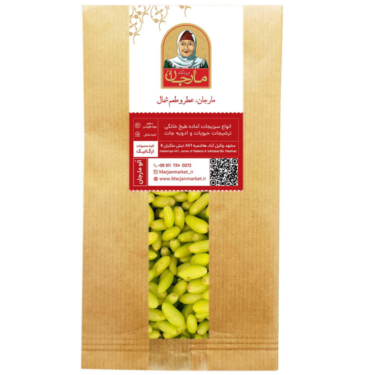 غوره دانه شده مارجان, کاملا ارگانیک, سبز یکدست, تهیه شده از غوره عسگری سبز درجه یک در بسته یندی پاکت لایه پلی اتیلن.این بستهبندی حاوی دانههای غوره سبز تازه و یکدست میتوانید برای تهیه انواع خورشت و خوراک استفاده کنید.