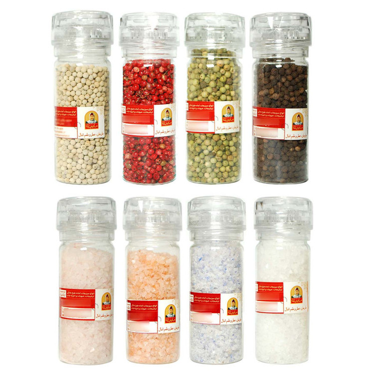 ست فلفل نمک مارجان حاوی دانه های فلفل سیاه فلفل سبز فلفل صورتی فلفل سفید مارجان محصولی با کیفیت از بهترین نوع دانه های فلفل وارداتی موجود در بازار و نمک آبی دلنمک و نمک صورتی و نارنجی هیمالیایی بسته سرآسیاب 8عددی مارجان کاملا طبیعی و ارگانیک. همراه با بسته مخصوص سرآسیاب دار ساخته شده از جنس پلی اتیلن بسیار کارا و مقاوم که دانه های فلفل و نمکها براحتی خرد میشود مناسب اشپزی و آشپزخانه .