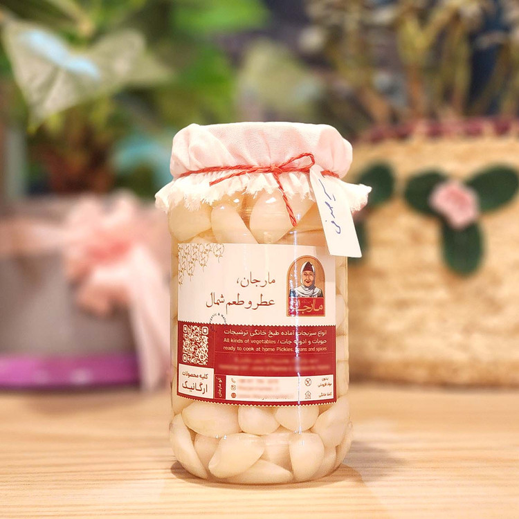 سیر ترشی با سرکه سفید مارجان نوعی چاشنی خوشمزه با عطر و بوی سیر است که در کنار غذای اصلی سرو میشود. این چاشنی به صورت سیر ترشی حبه ای و با استفاده از ادویه خاص مارجان و روشی کاملا بومی و سنتی بدون مواد نگه دارنده و کاملا ارگانیک تهیه میشود.در یخچال نگه داری شود.