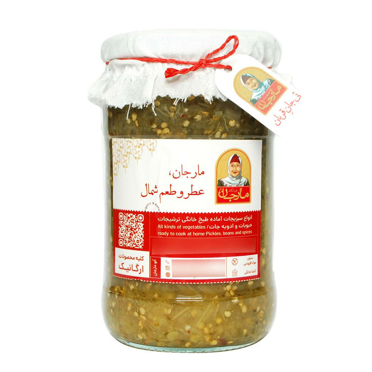 نازخاتون نوعی ترشی است که از بادمجان کبابی ساطوری، سیر و ریحان خرد شده و آب انگور (یا آبغوره) درست میشود. این چاشنی که از ترشی های معروف مازندران میباشد دارای مزهٔ دلنشینی است.گرچه نازخاتون غذای سادهای است، اما طعم نهایی آن پیچیده است و طعم بادمجان دودی با طراوت سبزی و تند بودن آب آن، این چاشنی را فوق العاده میکند.تمام محصولات مارجان ارگانیک و بدون مواد نگه دارنده است پس بهتره در یخچال نگهداری شود