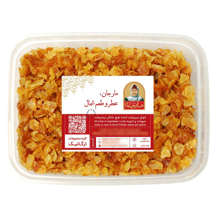 پیاز سرخ شده نگینی مارجان سایز نگین شده پیازها یکدست میباشد. سرخ شده در یکبار روغن اّب پیاز گرفته نشده تهیه شده به روش کاملا سنتی بسته بندی در ظروف طب دارای استاندارد نگهداری مواد غذایی فودگرید.تمام محصولات مارجان بدون مواد نگه دارنده است پس بهتره در یخچال نگهداری شود.