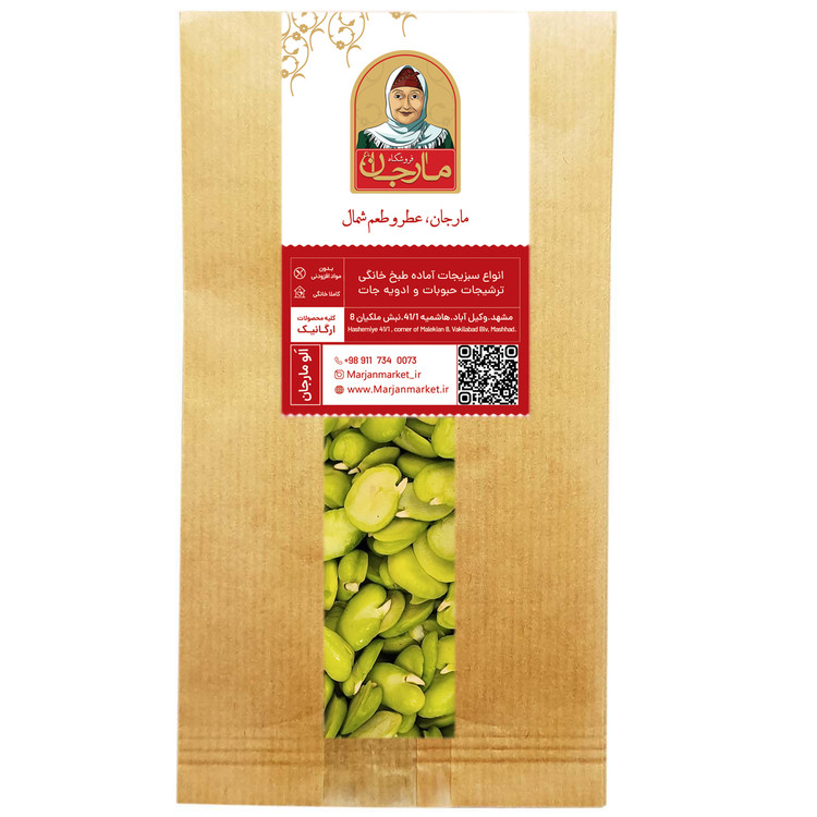 باقالی سبز یکدست و لپه شده مارجان در یک بسته بندی از جنس پلی اتیلن