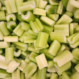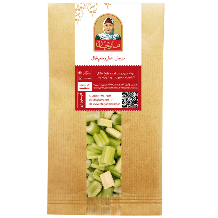 اسلایس کرفس خام فریز شده کاملا سبز و خرد شده به صورت تکه های یکدست، مارجان در یک بسته بندی از جنس پلی اتیلن