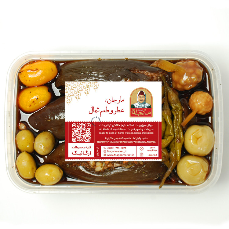 محتویات:بادمجان مشهد-سرکه خانگی-صیفی جات تازه-سبزی معطر شمالی-ادویه مخصوص ترشی مارجان.....